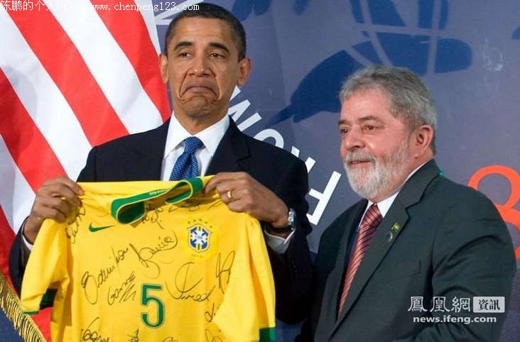 当地时间2009年7月9日,意大利拉奎拉,美国总统奥巴马手持一件巴西球队的签名球衣,旁边是巴西总统卢拉。