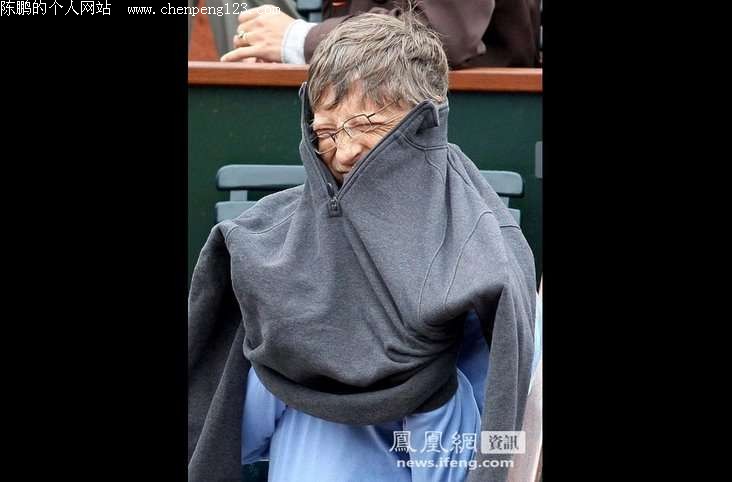 当地时间2009年6月6日,法国巴黎,比尔-盖茨现身09法国网球公开赛观看比赛,感觉凉意连忙穿衣服,可惜心急吃不了热豆腐,怎么套也套不进去,表情滑稽令人啼笑皆非。