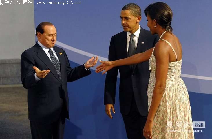 当地时间2009年9月24日,美国匹兹堡,G20峰会晚宴上,奥巴马夫妇以东道主身份负责迎宾,意大利总理贝卢斯科尼见到美国第一夫人米歇尔时显得相当高兴,伸出双臂示意互相拥抱。谁知米歇尔远远伸出一只手,示意握手打招呼,令场面显得很尴尬。更值得注意的是,站在一旁的奥巴马一脸冷漠,斜睨贝卢斯科尼,显得十分警惕。而反观英国首相布朗和法国总统萨科齐,皆得到拥抱礼的“待遇”,米歇尔更让布朗亲吻面颊,惟独贝卢斯科尼例外。