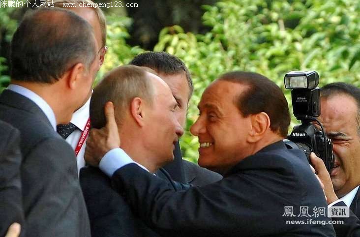 当地时间2009年8月6日,土耳其安卡拉,土耳其总理埃尔多安看着意大利总理贝卢斯科尼与俄罗斯总理普京拥抱。