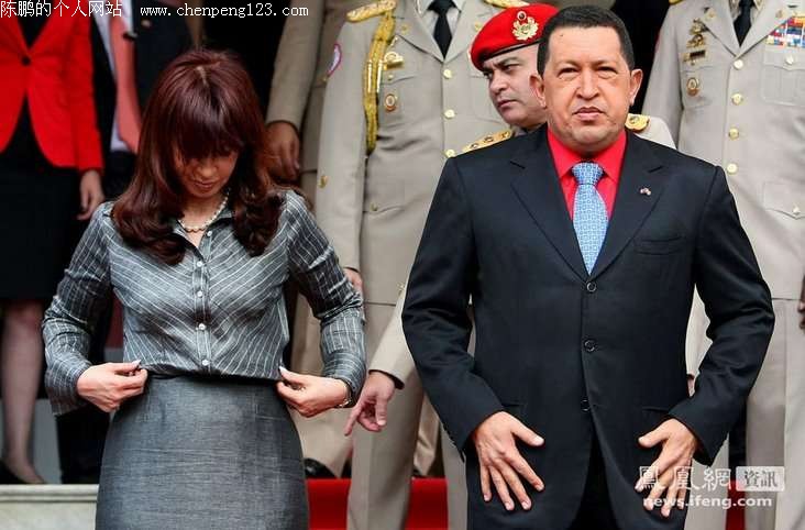 当地时间2009年8月11日,委内瑞拉加拉加斯,阿根廷总统费尔南德斯(左)和委内瑞拉总统查韦斯,两人在整理自己的仪容准备拍照。