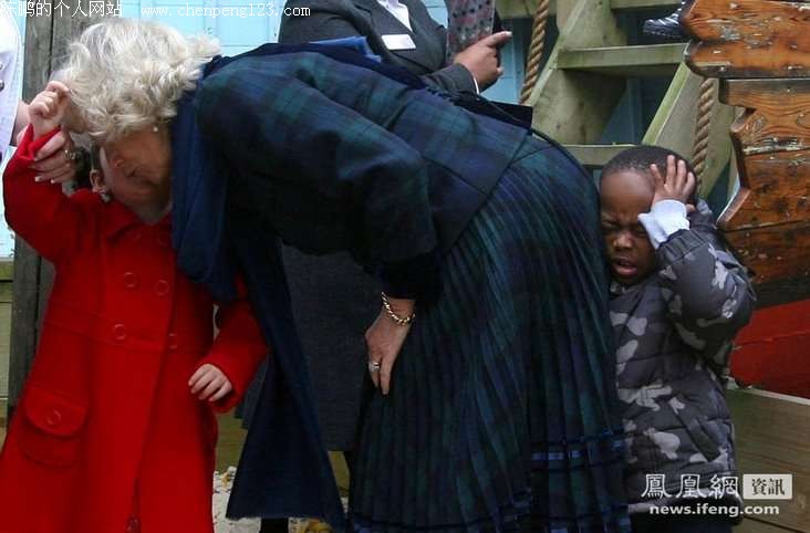 当地时间2009年11月19日,英国伦敦,康沃尔公爵夫人(卡米拉)弯腰让一个小女孩摸头发时似乎挤到身后另一个小孩,小家伙捂着头表情痛苦。