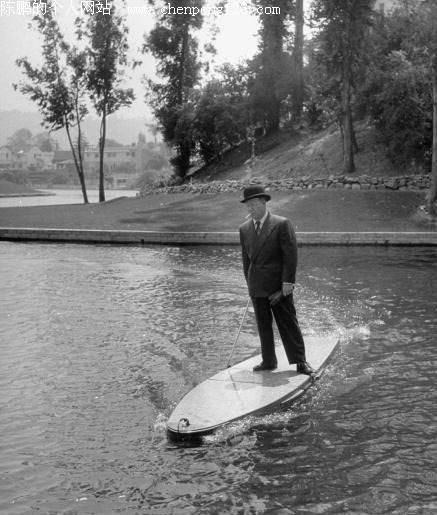 瞧,这是好莱坞发明家乔和他的摩托冲浪板,真不知道这情趣何在。