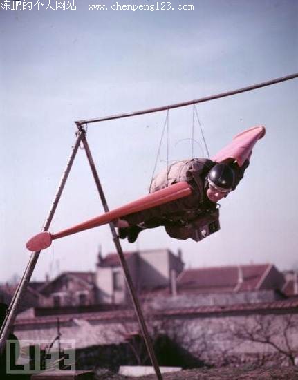 这个服装在单杠上挂着用的时候还蛮不错的,可以体验鸟的飞行。但不幸的是,他的发明者于1956年死在了自己的发明手上,因为他穿着鸟人服装从飞机上跳了下来。