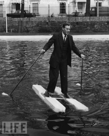 后面有小螺旋桨,发明家已经证明这个鞋子可以漂浮。但实用性呢?用这个渡过太平洋?要知道,1962年已经距离人类发明船不只一千年了。